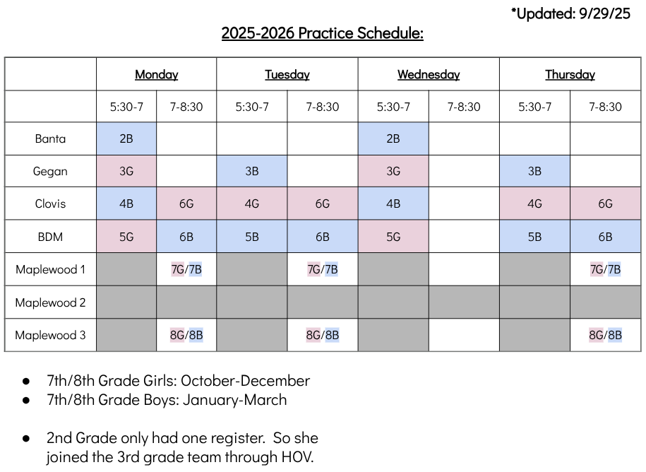 MBHC & MGBA Practice Schedule 2025-2026